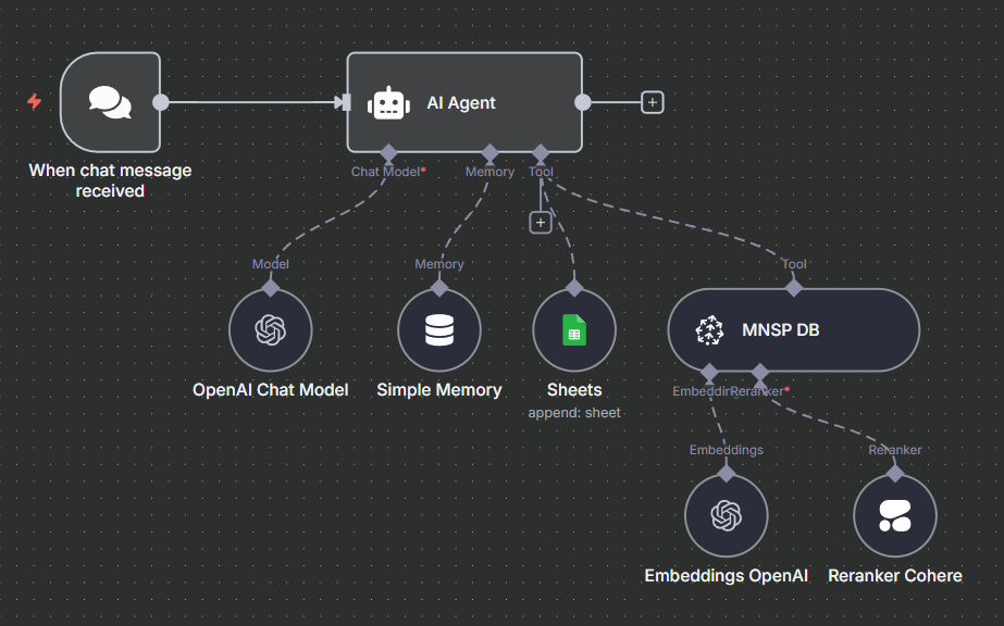 In a Retrieval-Augmented Generation (RAG) chatbot setup like this one, the AI agent can receive a user query, retrieve relevant company data stored in Pinecone DB, and generate contextual responses by leveraging LLMs such as GPT or Gemini.