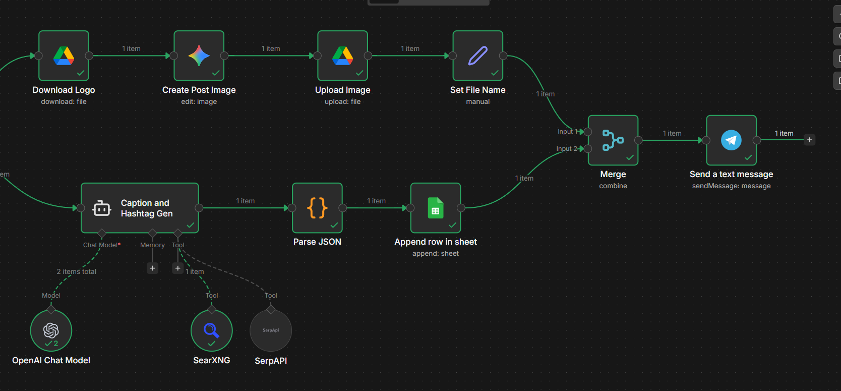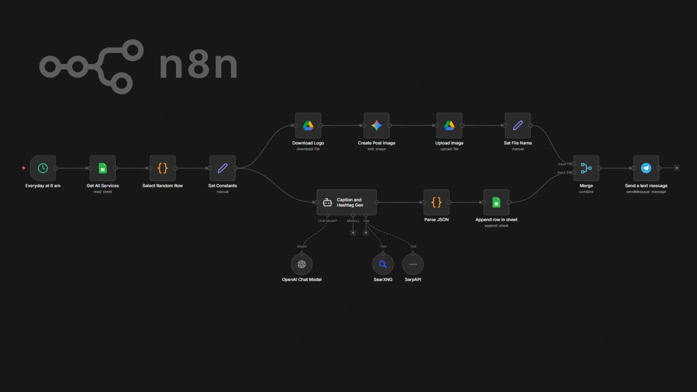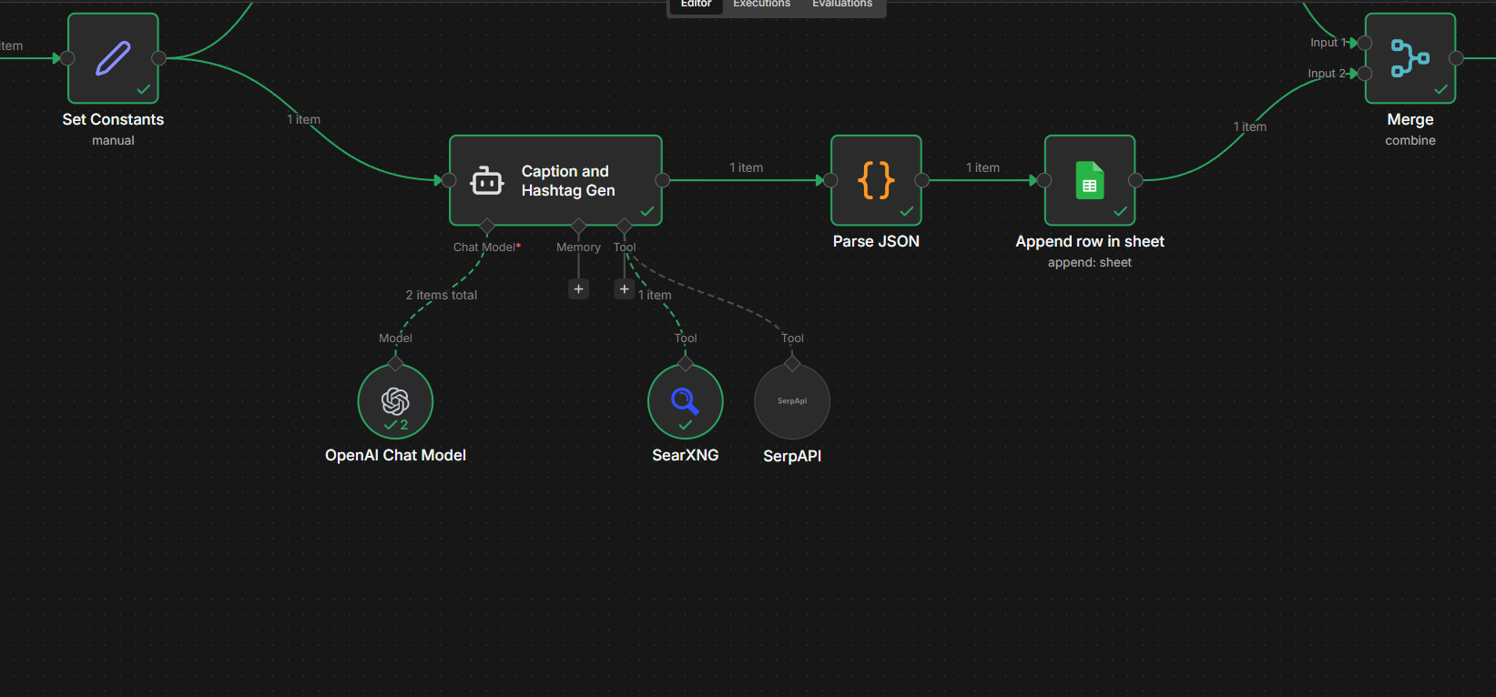 Added an AI Agent node for Caption and Hashtag generation. This node branches off from the “Set Constants” node. The idea is to perform different actions (image creation, caption creation) on different branches and merge the branches later.