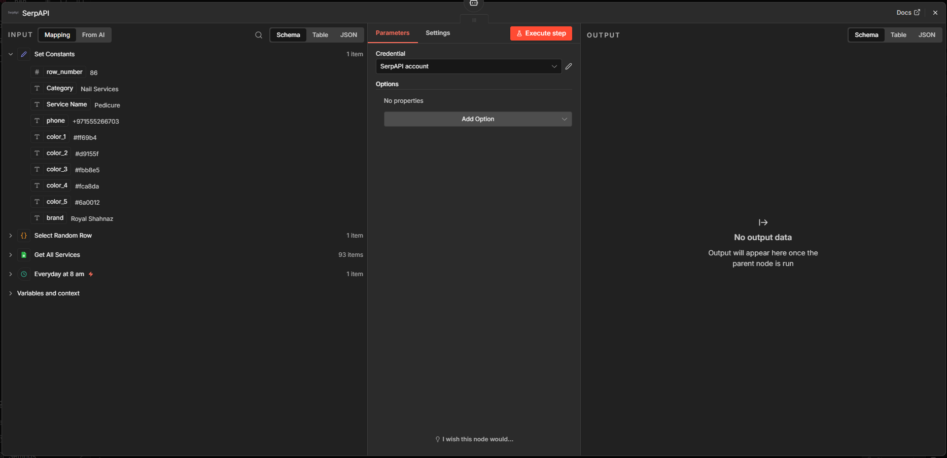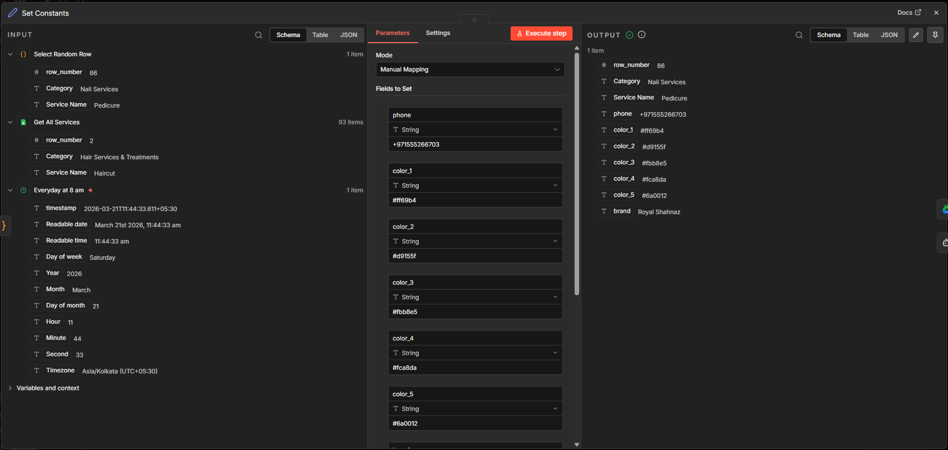 The Set (Edit Fields) node is used to set variables and filter unwanted key-value pairs. In this node, I set the phone number and the color scheme to be used for generating the image in a later node (5 colors from the client site).
