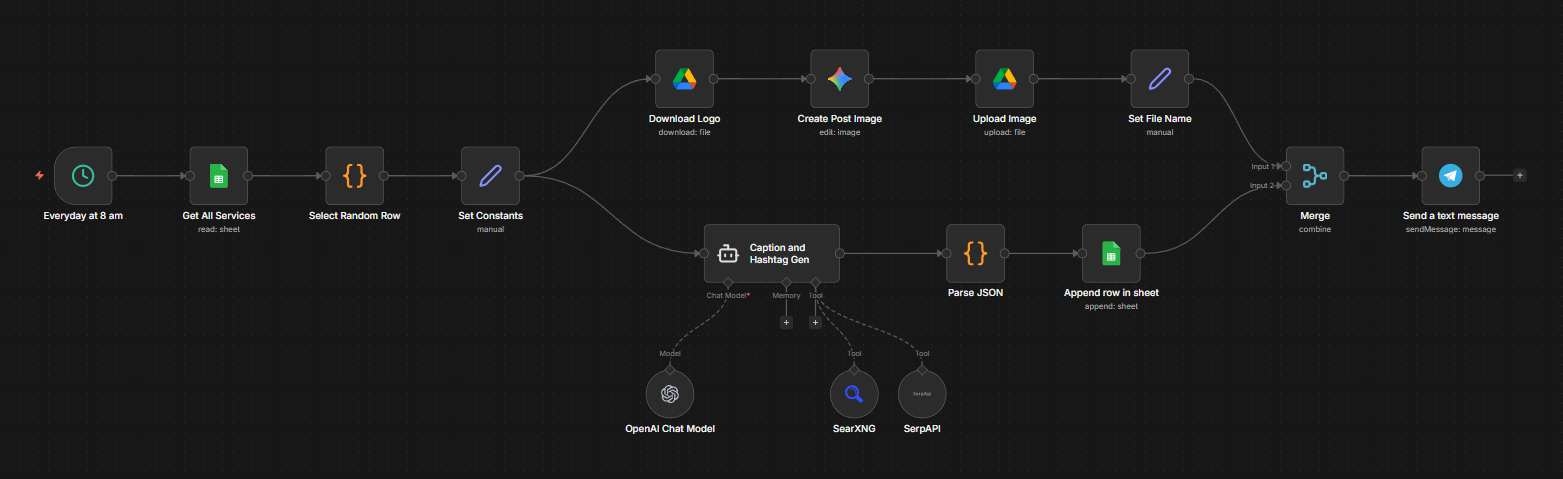 The n8n workflow runs every day at a set time (8 am). It first picks a random service from a Google Sheet of beauty salon services. It then generates an image with the beauty salon logo as input. This is done using the Google Nano Banana model. The image is uploaded to a Google Drive folder.