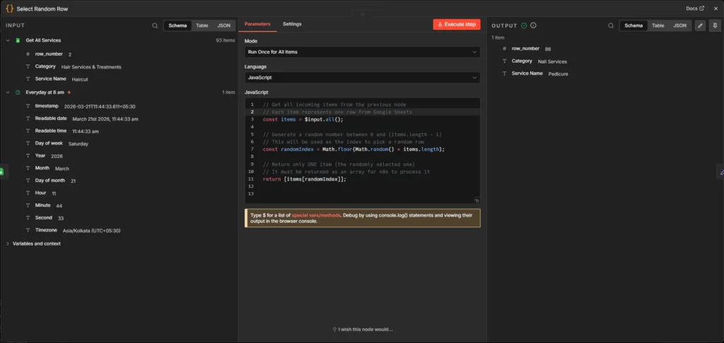Using the Code node, I selected a random row. Here’s the code, which: