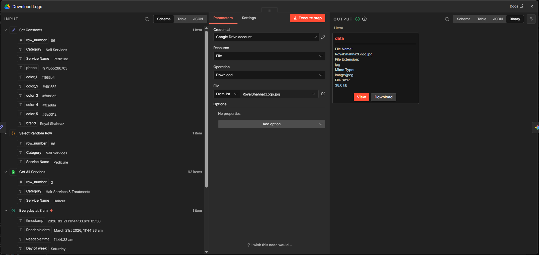 I uploaded the Royal Shahnaz logo to a Drive folder. I added a Google Drive node and selected the action “Download file”. Next, I enabled the Google Drive API from Google Cloud Console and set the OAuth credentials for Drive. Selected the logo from the file list. You can also specify a Drive URL pointing to the logo. When executed, it downloads and stores the binary file in a field called “data”.