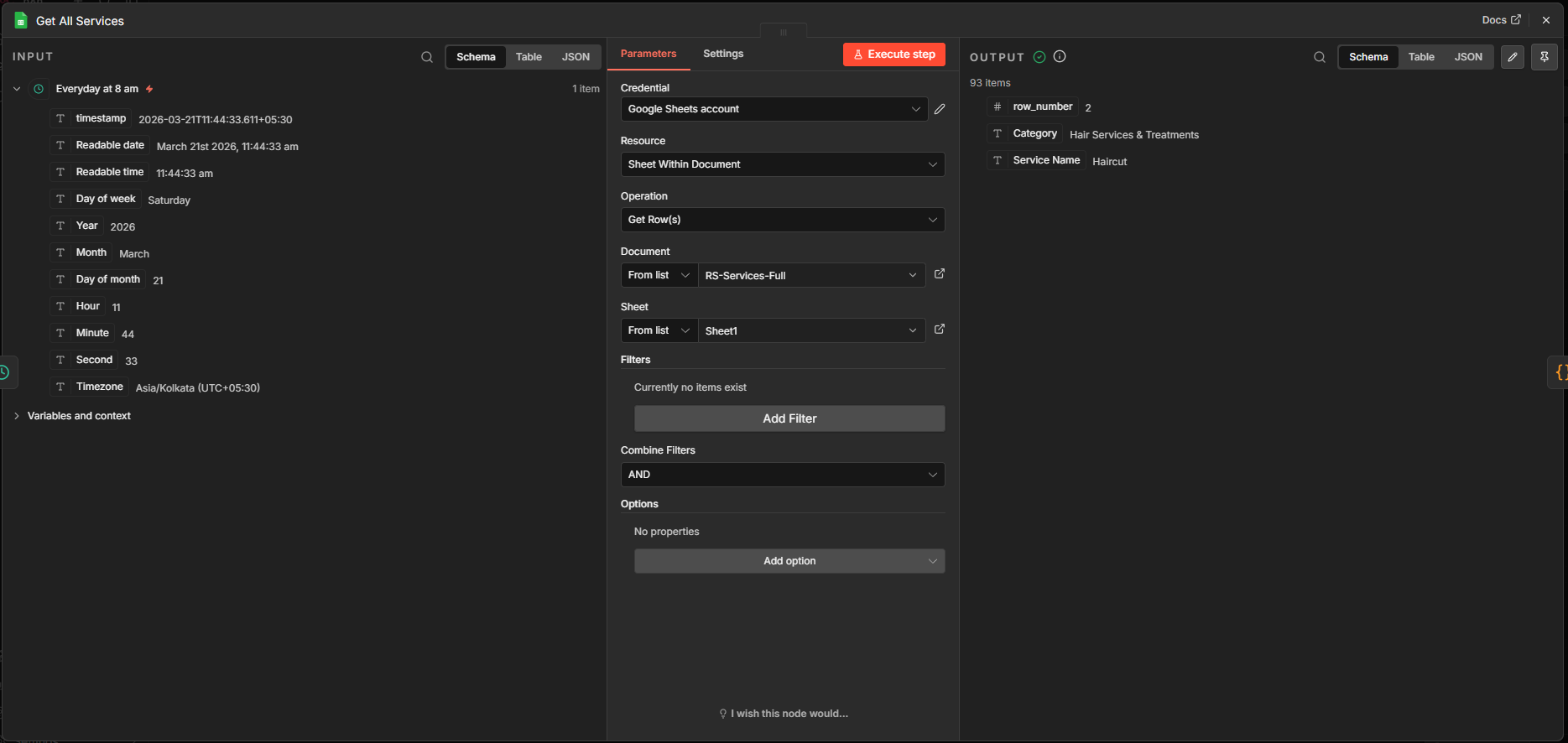 The Google Sheets node is configured to get all rows (services) from the Services sheet.