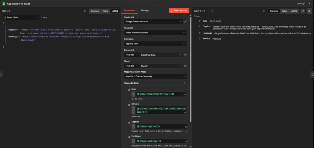 I used a Google Sheets node to append a row to a Google Sheet called “Insta Post Data” with the headers: Date, Service, Caption, Hashtags. The relevant action is “Append row in sheet”.