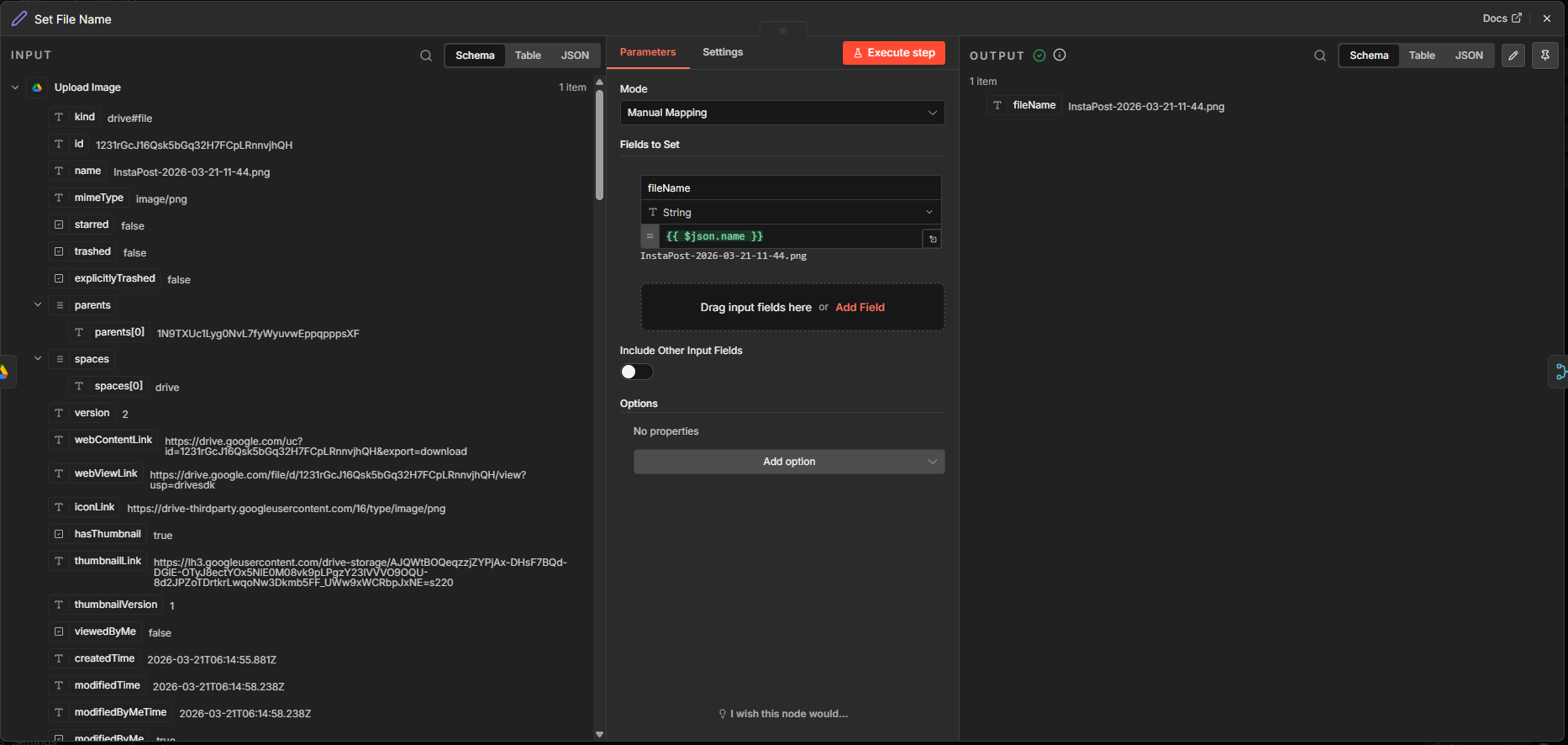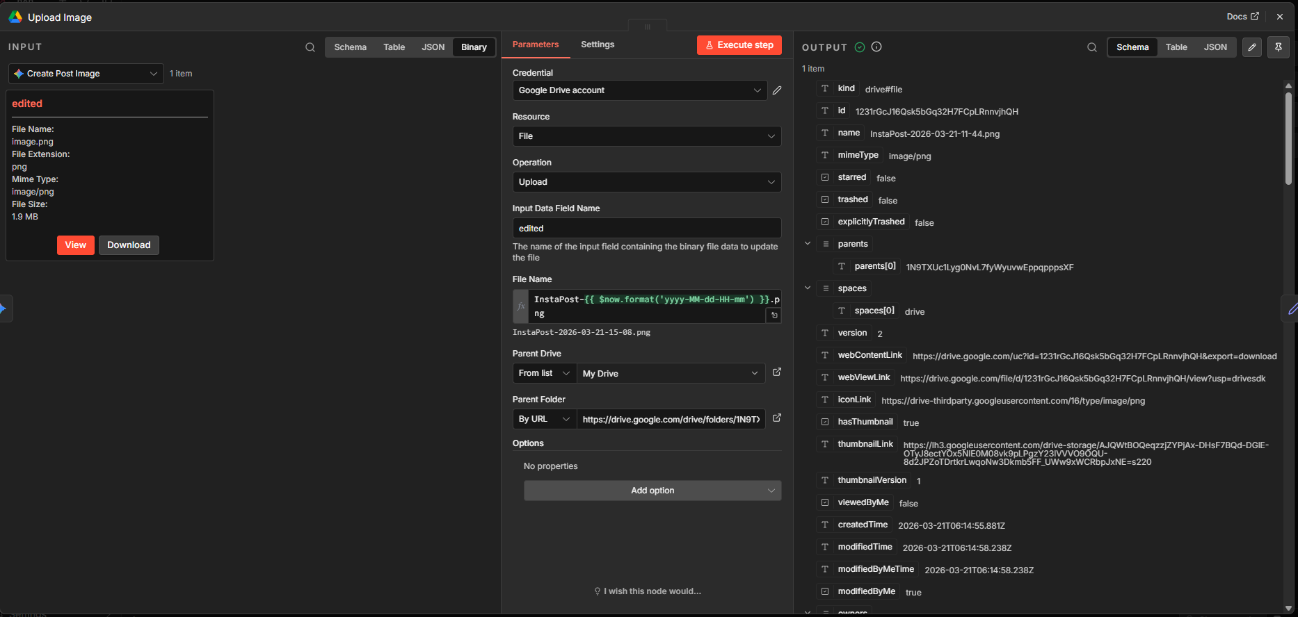 I added another Google Drive node and chose the action “Upload file”. Input data is the “edited” file from the previous node. I decided to name the file according to the date and time for uniqueness and ease of finding the image in the folder.