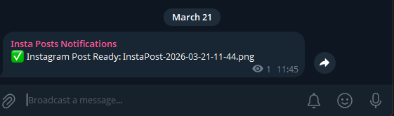 Telegram is used as a notification system to alert you when a new Instagram post is ready. Instead of constantly checking the workflow, you receive a real-time message with the post details. This allows for quick review and approval before publishing, adding a human checkpoint to the automation.