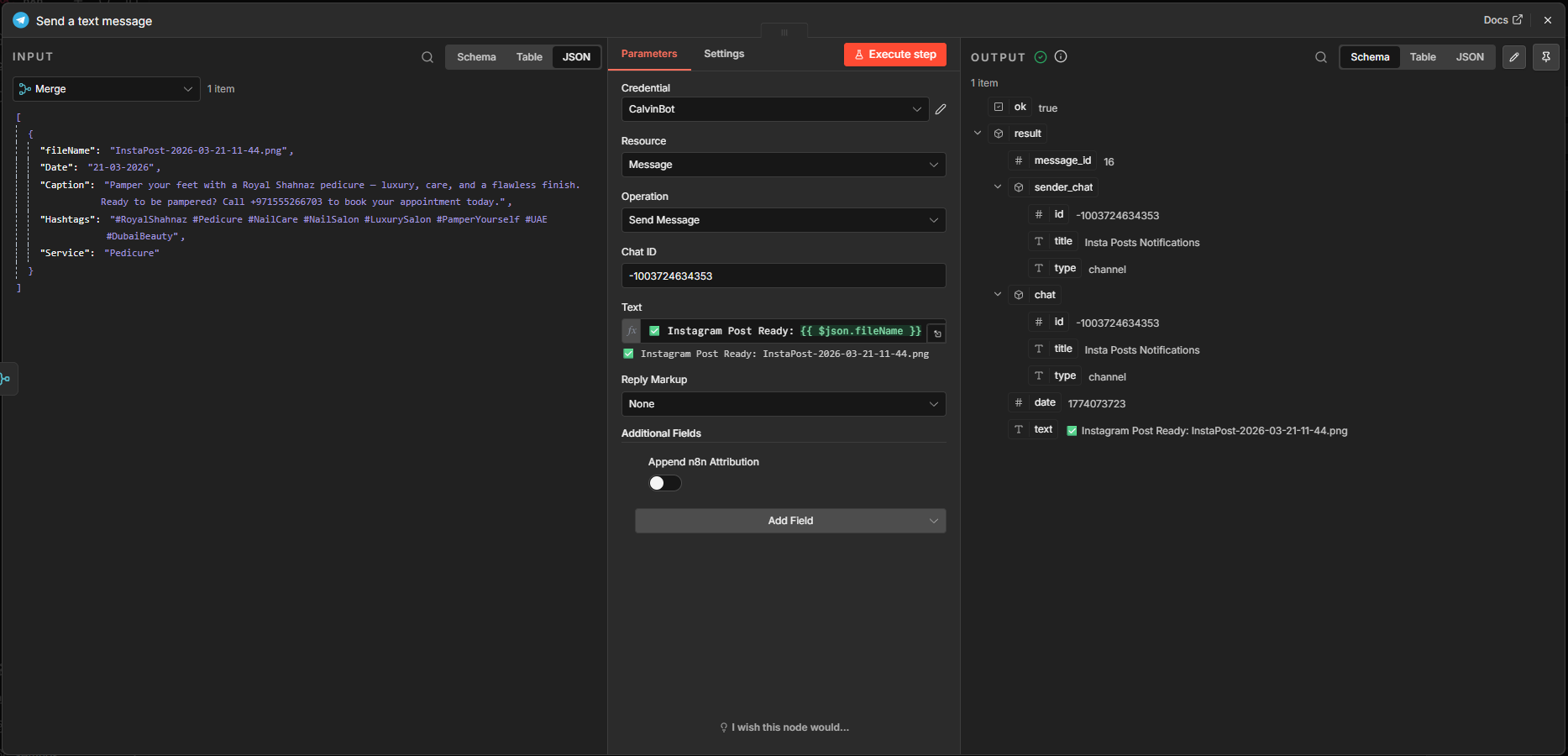 Once this is done, the workflow notifies me via Telegram that a new post is available for me to review.
